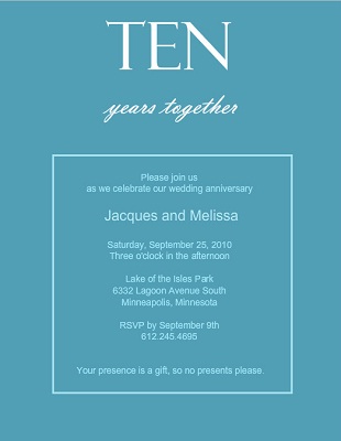 Yep, these posts contain over home birthday party themes, ideas, tips, tutorials, and inspiration. Just because it's called the tin anniversary doesn't mean you have to gift the metal—the modern and traditional themes are guidelines rather than a hard and fast rule. Your resource to discover and connect with designers worldwide. Find customizable 10 year anniversary invitations of all sizes. This opens in a new window.